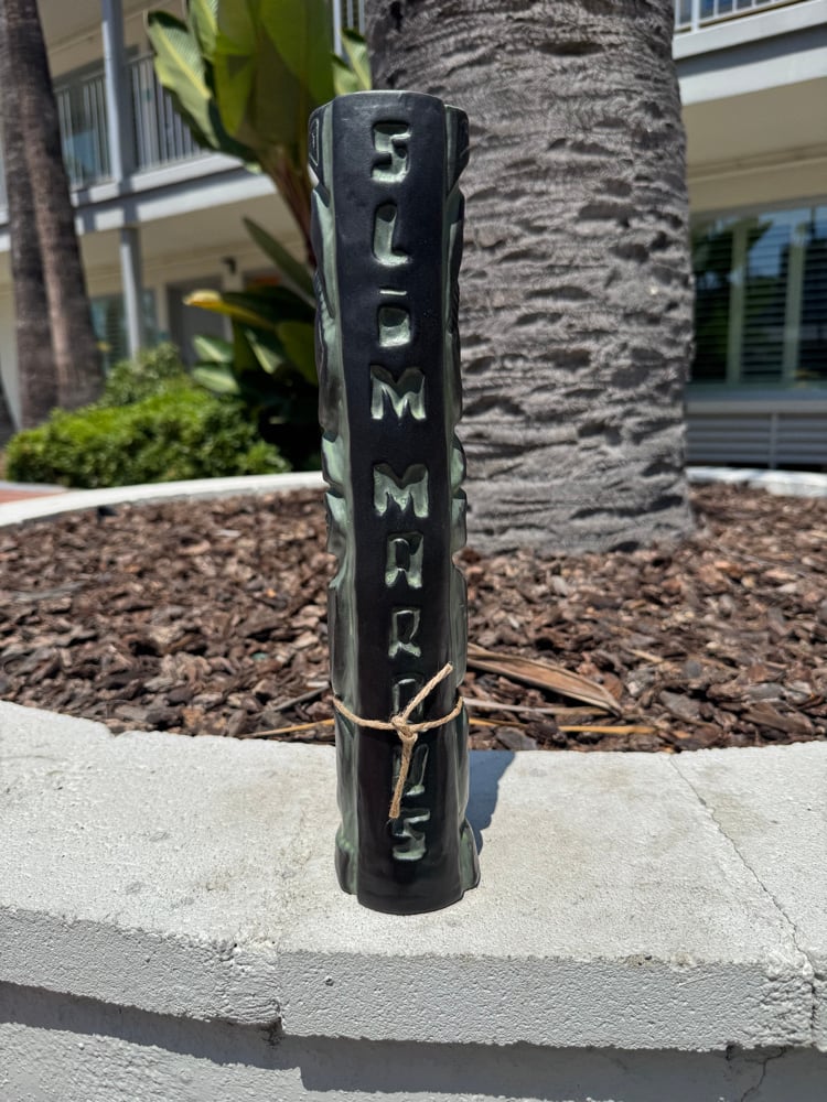 3/10 Slim Marqus mug!Leftover sale from Tiki Oasis 25! Featuring special one of a kind black and green glaze! Approximately 13 inches tall, fitting plenty of tiki drink for your needs!